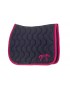 Tapis de selle "Diamant" Pénélope matelassé en vague, galonné d'une fine tresse et orné de strass tout autour. Il a une belle ligne de dos bien dégarroté et une jolie broderie Pénélope à l'arrière des deux cotés. Il est doublé par un tissu nid d'abeille respirant qui absorbe la transpiration du cheval et apporte un maximum de confort.